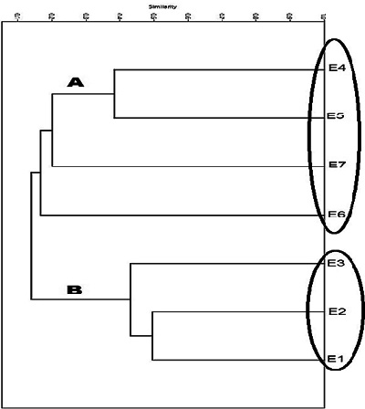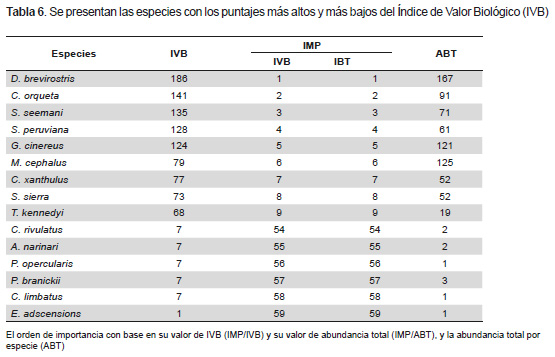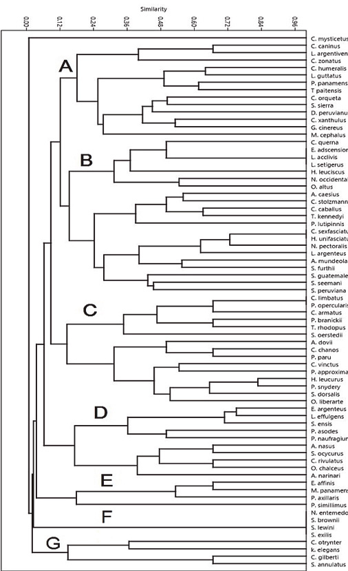 ambientales en la dársena de Puerto Chiapas, México. Abundancia. Se capturaron 1,400 peces correspondientes a 33 familias, 52 géneros y 72 especies. La familia mejor representada fue Carangidae con 15 especies; los géneros más abundantes fueron Caranx y Selene con cuatro especies; la especie más abundante fue Diapterus brevirostris con 167 organismos (Tabla 3). Abril y octubre fueron los meses en los que se obtuvieron mayor número de ejemplares. Los meses de agosto y noviembre fueron los de menor abundancia. En mayo se determinó el más alto número de especies con 28, seguido de febrero (26); en agosto se registraron sólo 4 especies. Las estaciones 1, 2 y 3 fueron las que tuvieron el mayor número de organismos recolectados. Las estaciones más diversas fueron la 1 y 2; la estación con menor número de especies fue la 4. Del total de las especies encontradas, dos se presentaron en todas las estaciones de muestreo Chloroscombrus orqueta y Diapterus brevirostris. ![]() ![]() Clasificación ecológica. De las 72 especies capturadas, 4,2% correspondió a especies dominantes, 13,9% fue clasificada como ocasionales, mientras que 38,9% fueron especies constantes y 43% se catalogó como especies raras (Tabla 3). Riqueza específica. El valor promedio más alto se presentó en mayo, DMg=1,59, y el más bajo se registró en agosto, DMg=0,38; sin embargo, no se registró diferencia significativa (p>0,05). Por estaciones se registraron importantes variaciones, desde 0,48 en la estación E4, hasta 2,13 en la estación E2. Las estaciones E1, E2 y E3 presentaron valores mayores a 1 y las estaciones E4, E5, E6 y E7 presentaron valores promedio menores a 1 (p<0,05). Valores de riqueza específica por meses y por estaciones se presentan en el Tabla 4. Equitatividad. El índice de equidad mostró un incremento en los meses de mayo, julio, septiembre, octubre y diciembre, y registró un claro descenso en el mes de agosto; sin embargo no existieron diferencias significativas (p>0,05, Tabla 5). Por estaciones, se observaron valores similares en E1, E2 y E3 (estaciones cercanas al océano), mientras que en E4, E5, E6 y E7 (estaciones ubicadas dentro de la dársena del Puerto) se observaron valores menores a 1 (p<0,05, Tabla 5). No existió equidad tanto espacial como temporalmente porque el valor de H´ calculado estuvo alejado del ln S (Moreno 2001); así, en octubre, donde se registró la menor diferencia entre H y el ln S, esta fue de 50,8%. Los valores de H´ se presentan en la Tabla 5. Índice de Valor Biológico (IVB). Las especies D. brevirostris, Chloroscombrus orqueta y Selene peruviana presentaron los valores más altos, mientras que las especies Epinephelus adscensionis, Cirrhitus rivulatus, Aetobatus narinari, Carcharhinus limbatus, Chanos chanos, Oligoplites altus, y Trachinotus rhodopus presentaron valores bajos de IVB (Tabla 6). El IVB fue comparado con la Serie de Números de Hill y se obtuvo la misma lista de especies muy abundantes. Análisis de conglomerados. El análisis de conglomerados de las especies identificadas definió siete grupos. Se observa que Cetengraulis mysticetus se mostró totalmente aislada (Figura 3) y el análisis de las estaciones mostró dos grandes grupos dentro del sistema: el grupo A conformado por: E4, E5, E6 y E7, el grupo B formado por: E3, E2 y E1 (Figura 4). Relación organismo-ambiente. La salinidad y pH presentaron un nivel de correlación con la riqueza de especies. En el primer caso la correlación fue baja (r=0,62) y no significativa (p>0,05). Para el segundo caso se encontró una mayor correlación y fue significativa (r=0,89; p<0,05). Figura 3. Similaridad de especies según el índice de Bray Curtis entre las estaciones