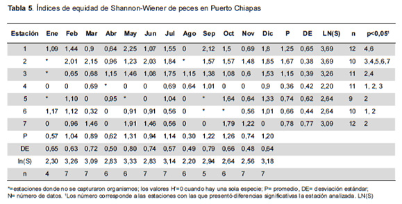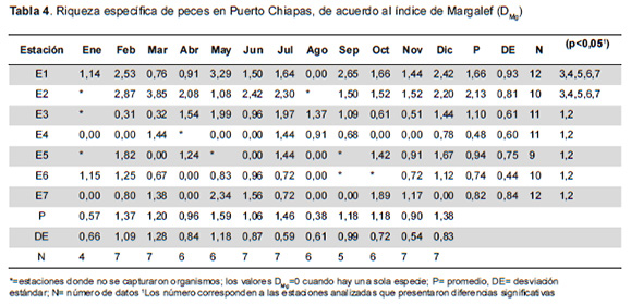 Las condiciones ambientales de la dársena de Puerto Chiapas claramente siguen un patrón estacional de lluvias y estiaje. En cuanto a la diversidad de peces, el área resultó con alta diversidad, alta equitatividad y baja dominancia de especies. La mayor riqueza de especies se presentó en el área próxima al mar (E1, E2 y E3). Es importante y necesario continuar con los estudios referentes con el conocimiento de la alta riqueza de especies, que surge como un indicador de fragilidad ecológica que respalda la necesidad de establecer un plan de conservación y manejo sustentable de biodiversidad íctica. Agradecimientos