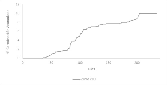 La totalidad de las semillas recolectadas de los frutos y de las fecas de zorro se encontraron sin daños físicos. El GS de las semillas de los frutos fue 77±11 días y continuaron germinando hasta el día 172. Al cabo de este período 14,3% de las semillas sembradas habían germinado (Figura 1). El GS de las semillas provenientes de las fecas de los zorros en cautiverio fue de 69+7 días y la germinación ocurrió hasta el día 203 cuando 33,3% de las semillas germinaron (Figura 1). No se encontraron diferencias significativas entre los tratamientos en el GS ni en la GR la cual fue de 0,20±0,43 para las semillas de los frutos y 0,23±0,07 para las semillas de las fecas de zorro. Se encontraron diferencias en el PG el cual fue significativamente mayor para las semillas provenientes de las fecas del zorro (33,3%) que para las semillas provenientes de los frutos (14%) (t =-0,19; p=1*10-6). La prueba de viabilidad de tetrazolio mostró que entre 98% y 90% de las semillas de los frutos y de las fecas respectivamente eran inviables al cabo de 234 días. Figura 1. Porcentaje (%) de germinación acumulado a través del tiempo (días) de las semillas de Celtis