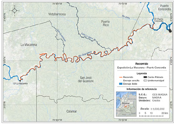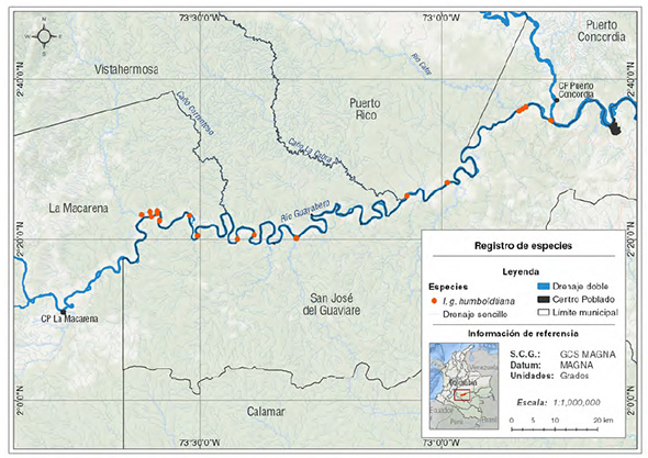 La complejidad ecológica y geológica del subcontinente austral de América, incluida la presencia de barreras naturales (rápidos y cascadas), dinámicas fluviales particulares (pulsos de inundación), han generado un mosaico de ecosistemas acuáticos que varían en sus parámetros físicos, químicos, niveles de productividad y biomasa (McClain y Naiman, 2008), estas variables ambientales influyen de manera determinante, parámetros poblacionales para los delfines de río, organismos considerados depredadores tope en estos ambientes (Mosquera-Guerra et al. 2019a). De otra parte, el aislamiento de poblaciones, en áreas con presiones selectivas diferenciales, han promovido eventos vicariantes entre cuencas, resultando en tres especies en el género Inia (Cetartiodactyla: Iniidae): Inia geoffrensis (Da Silva et al. 2018), con las subespecies: I. g. geoffrensis (De Blainville 1817), distribuida en la cuenca del Amazonas (Da Silva 2009); e I. g. humboldtiana (Pilleri y Gihr, 1977), presente en la macrocuenca Orinoco (Herrera et al. 2017); taxones a los que se suman, I. boliviensis, establecida en las cuencas del Mamoré e Iténez en Bolivia (Aliaga-Rossel 2002, Banguera-Hinestroza et al. 2002, Aliaga-Rossel et al. 2006, Ruiz-García et al. 2008, Ruiz-García 2010), y el río Madeira compartido por Bolivia y Brasil (Gravena et al. 2014); y finalmente, I. araguaiaensis, que ocurre en el complejo hidrológico de los ríos Araguaia-Tocantins en Brasil (Hrbek et al. 2014). Históricamente para Colombia, las poblaciones de delfines de río de la Amazonía, han recibido una mayor atención en la investigación que aquellas de la Orinoquía, donde aún existen extensas áreas para las que no se han generado datos demográficos (Trujillo et al. 2019a). Poblaciones de I. g. humboldtiana, han sido documentadas para los ríos: Meta, Guayabero, Yucao, Manacacías, Tillavá, Planas, Vichada, Tomo, Tuparro, Guaviare, Inírida, Bita, Arauca, Cravo Norte, Casanare y Orinoco (Trujillo 2000, Diazgranados y Trujillo 2004, Mosquera- Guerra et al. 2015a); donde estos cetáceos se encuentran expuestos a diferentes tensores antropogénicos (Mosquera-Guerra et al. 2016; Herrera et al. 2017), tales como: la fragmentación y transformación de ecosistemas acuáticos; contaminación acústica (Trujillo et al. 2016; Davidson et al. 2012; Diazgranados y Trujillo 2004); riesgo de colisión con embarcaciones (Ávila et al. 2018); enmallamiento; muertes por retaliación, como resultado del conflicto con las pesquerías artesanales e industrial por competencia por el recurso pesquero o daño a los artes de pesca (Trujillo et al. 2006, 2010, Da Silva et al.2011; Mintzer et al. 2013); biomagnificación de metales pesados, como el mercurio en la red trófica acuática (Mosquera-Guerra et al. 2015b, 2018a, 2019a); captura de individuos para su uso como atrayente en la pesca del pez mota o come muerto (Calophysus macropterus), sobre todo en localidades fronterizas entre Colombia y Venezuela en los ríos Arauca, Meta y Orinoco (Mosquera-Guerra et al. 2015d); y finalmente, los efectos negativos del cambio climático (Mosquera-Guerra et al. 2015b, 2018a). Debido a estos estresores, los delfines de río son considerados entre los cetáceos más amenazados del planeta (Crespo et al. 2003). Recientemente, la condición de amenaza internacional de I. geoffrensis se elevó de Datos Insuficientes (DD) a En Peligro (EN, Da Silva et al. 2018), y en Colombia, este taxón se considera vulnerable (VU, Trujillo et al. 2006; Minambiente 2017). Además, la especie se encuentra en el Apéndice II de la Convención sobre el Comercio Internacional de Especies Amenazadas de Fauna y Flora Silvestres (CITES 2019). En este contexto, se hace urgente la generación de información sobre el estado poblacional de I. g. humboldtiana para áreas estratégicas en su distribución por su contribución biogeográfica y ecológica, como la cuenca del río Guayabero, principal tributario del río Guaviare, que junto al Inírida y el Atabapo, conforman el cauce principal del río Orinoco. Materiales y métodos